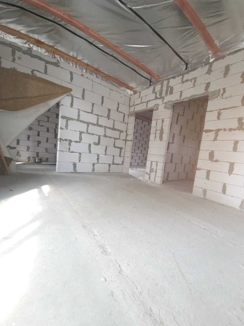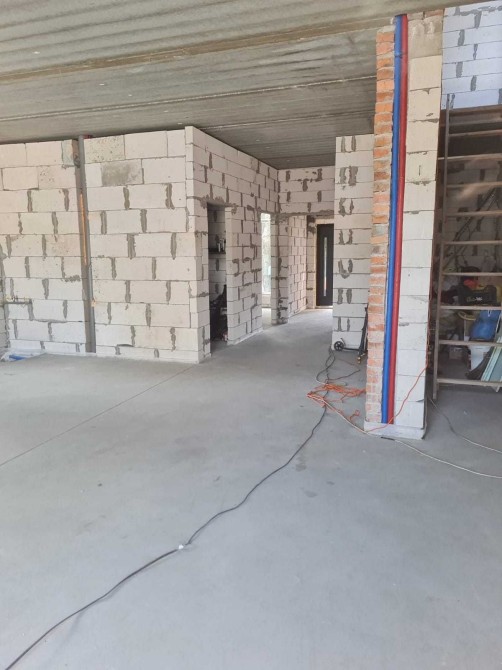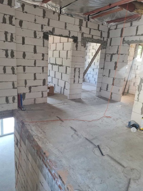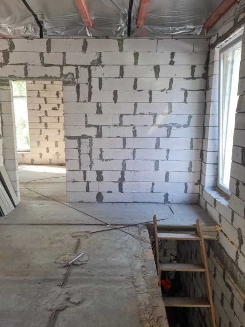 Фундамент стрічковий, 100*40 см, утеплений, гідроізольований. Газоблок стоунлайт (d500 b2,5, розмір 600*300*200), використовувалось армування сіткою кожні три-чотири ряди. Перекриття. Жб плити ТОВ «Ковальська-Бетон», які пролиті між собою в п-образну армобалку та анкеровані між собою.