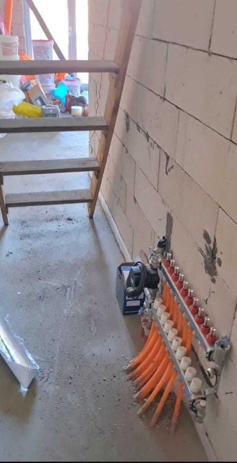 Тепла підлога. Колектор Bianchi, насосна группа TM3 Mixing Unit, насос Alpha-1. Труба водяної підлоги виробництва Іспанії. Зроблені обігрів панорамних вікон (для уникнення запотівання та появи грибка), обігрів стіни яка знаходиться з північної сторони, а також відсікаючим холод контуром по периметру будинку.