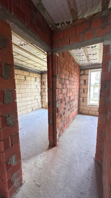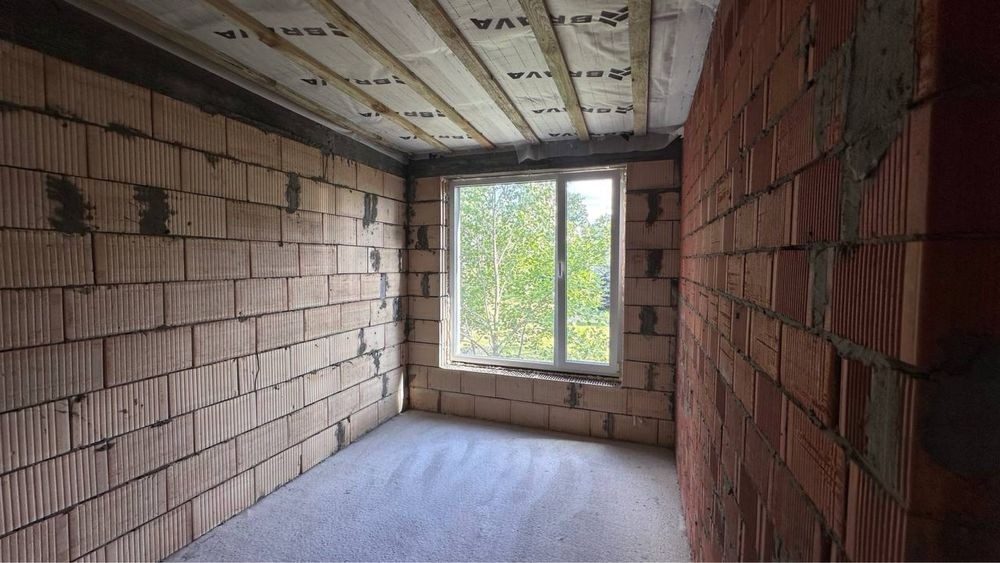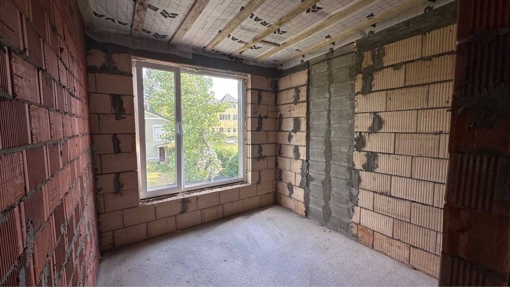 Будівництво виконано з керамоблоку на монолітно-стрічковому фундаменті. Міжповерхове перекриття — з бетонних плит, сходи також бетонні. Утеплення стін — пінопласт 120 мм, вікна — енергозберігаючі склопакети. Особливу увагу приділено покрівлі: багатошарова конструкція із якісних матеріалів, включаючи паро- та гідроізоляцію, утеплювач товщиною 200 мм, мембрану Bauder та дерев’яну конструкцію. Така система забезпечує теплоізоляцію, довговічність і комфорт у будь-яку пору року.
