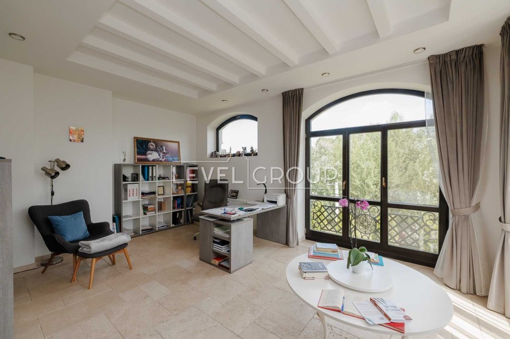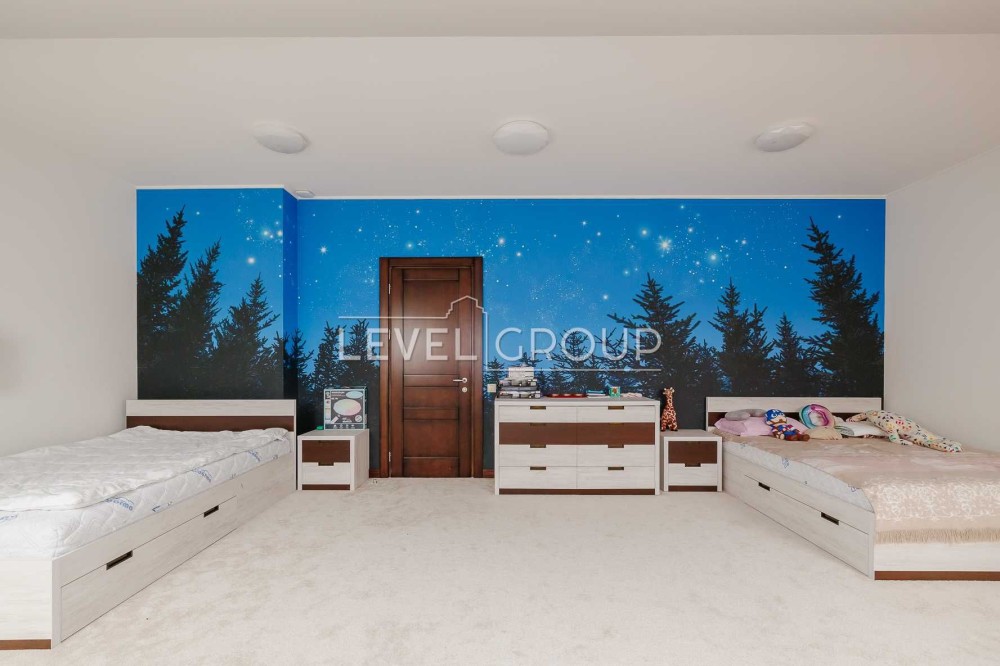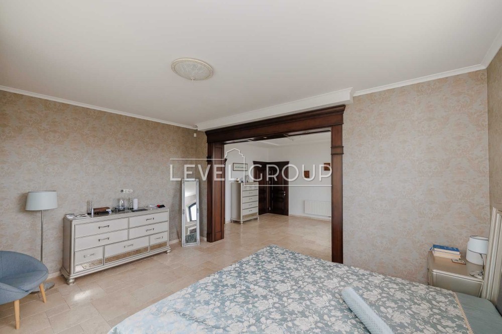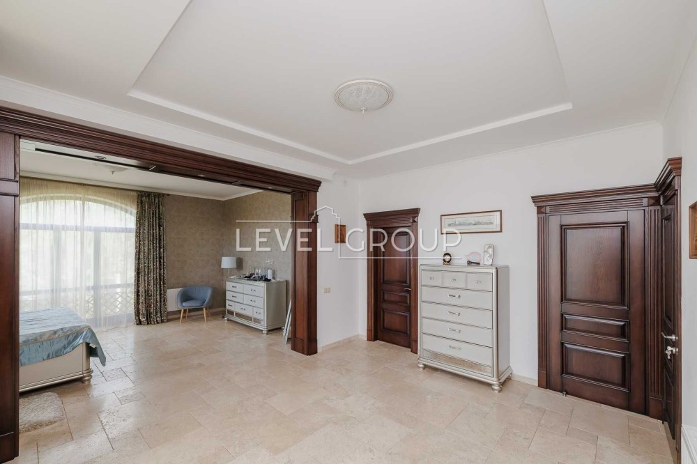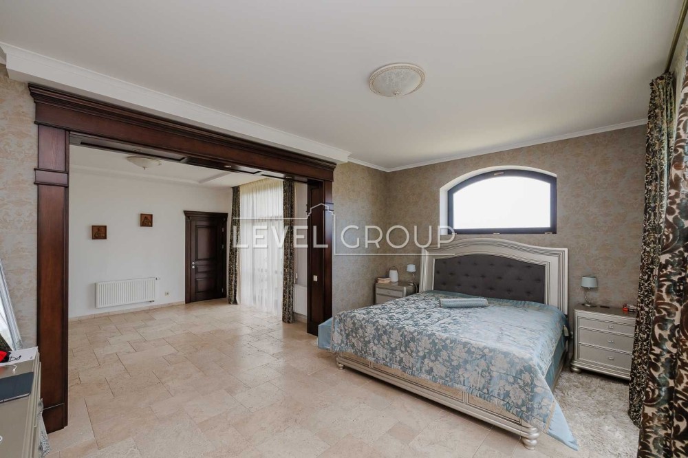 В доме 6 спален (хозяйская зона 80м2), 4 санузла, большая гостиная с винтажным камином, кухня (газ) и столовая, оборудованная дорогой эксклюзивной мебелью и техникой, спортзал, гараж и ряд технических помещений.