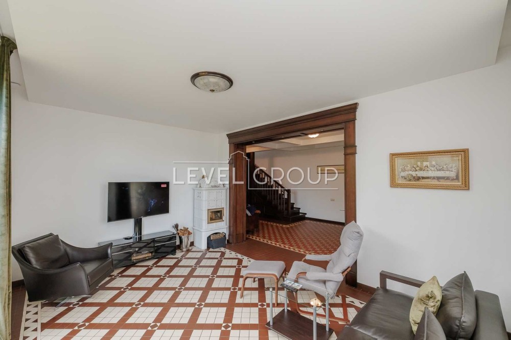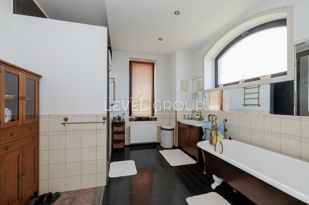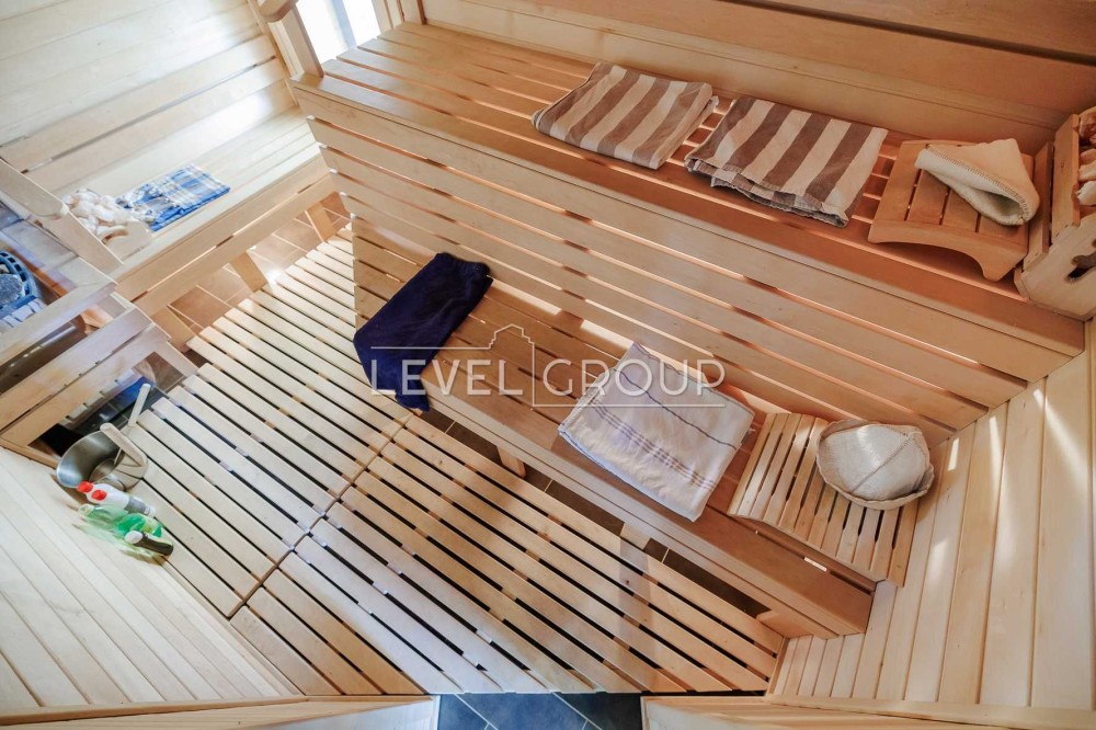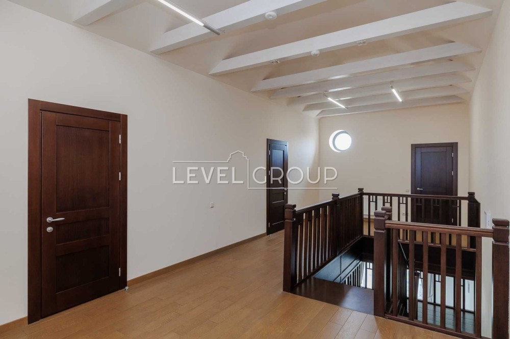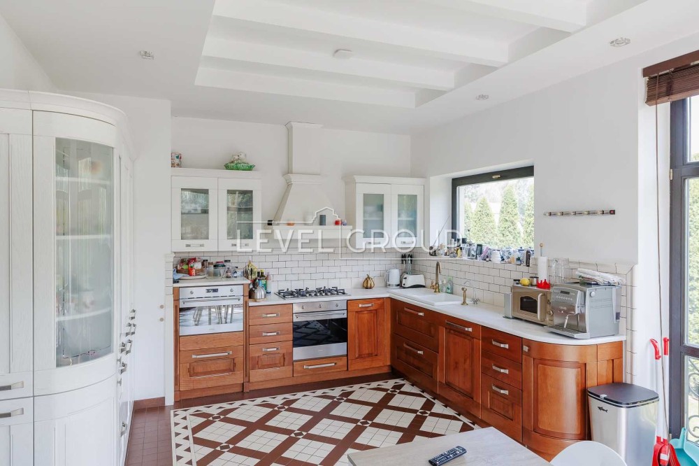 В доме 6 спален (хозяйская зона 80м2), 4 санузла, большая гостиная с винтажным камином, кухня (газ) и столовая, оборудованная дорогой эксклюзивной мебелью и техникой, спортзал, гараж и ряд технических помещений.