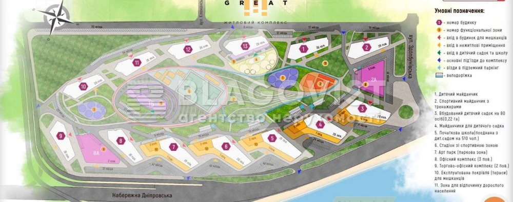 ЖК"Great", 13 будинок, комплекс комфорт-класу, розташований на Дніпровській набережній, уздовж берега Дніпра, підземний паркінг та власна інфраструктура, поруч парк із пляжем "Прибережний", ТРЦ "River Mall", ТРЦ "Аркадія"