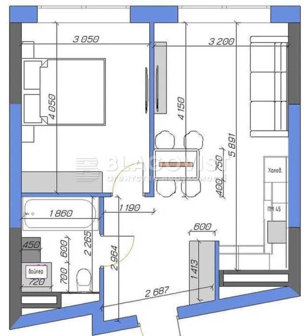Загальна площа 45 кв.м, житлова 16, 6, кухня-16 кв.м.