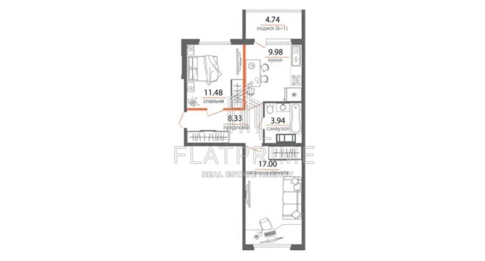 Загальна площа 45 кв.м, житлова 16, 6, кухня-16 кв.м.