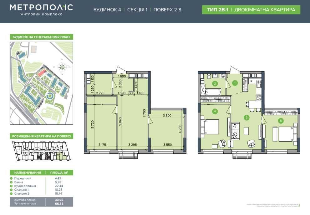 Квартира розташована на 2 поверсі. Загальна площа 66.3 м², сучасне планування, кухня-вітальня 22.4 м², дві окремі кімнати. Стан після будівельників.
