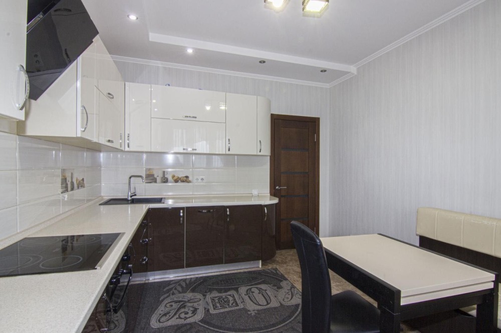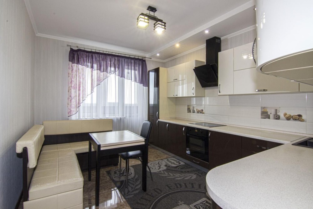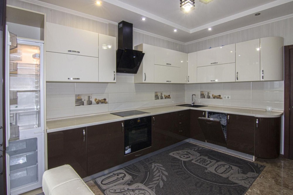 Кухня 13,9 кв.м. з виходом на засклений балкон. Встановлена вбудована кухня з побутовою технікою: варильна поверхня, духова шафа, витяжка, посудомийна машинка, вбудований холодильник; обідній стіл зі стільцями та м’яким кутком.