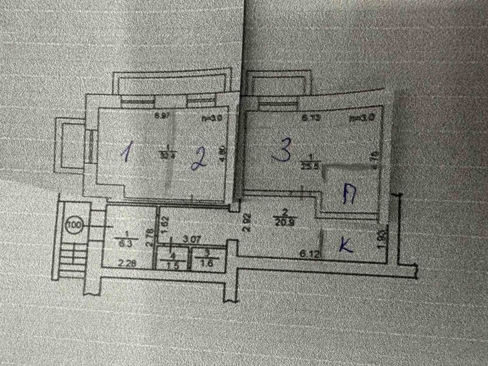 3 окремі кімнати, санвузол, кухня та підсобна кімната.