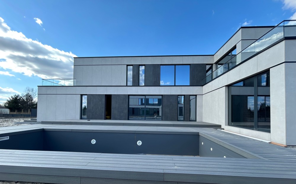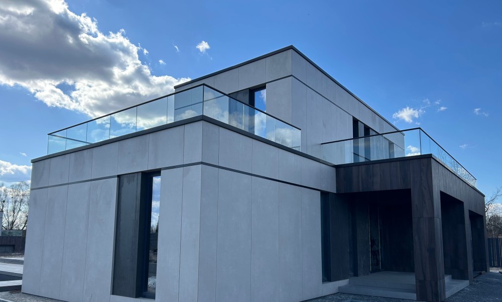 Фасад: Вентильований фасад з утепленням мінеральною ватою (150 мм) та оздобленням широкоформатною керамогранітною плиткою преміум-класу (Іспанія)