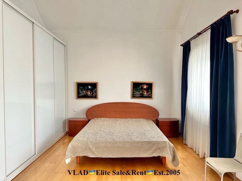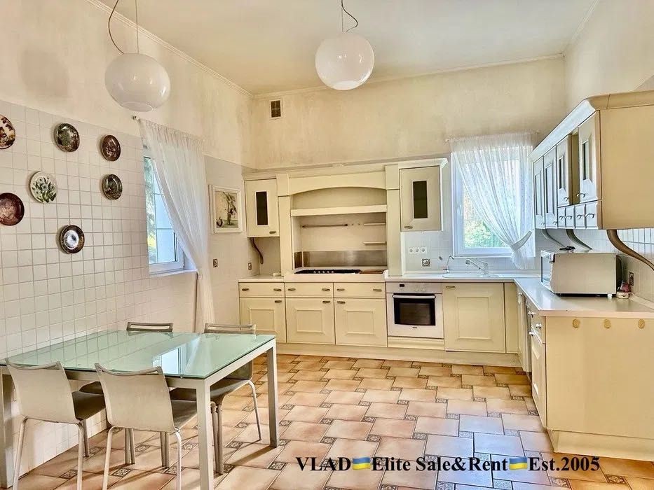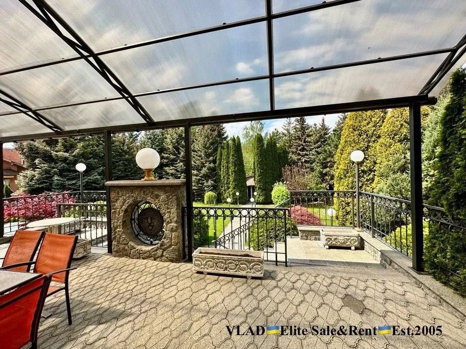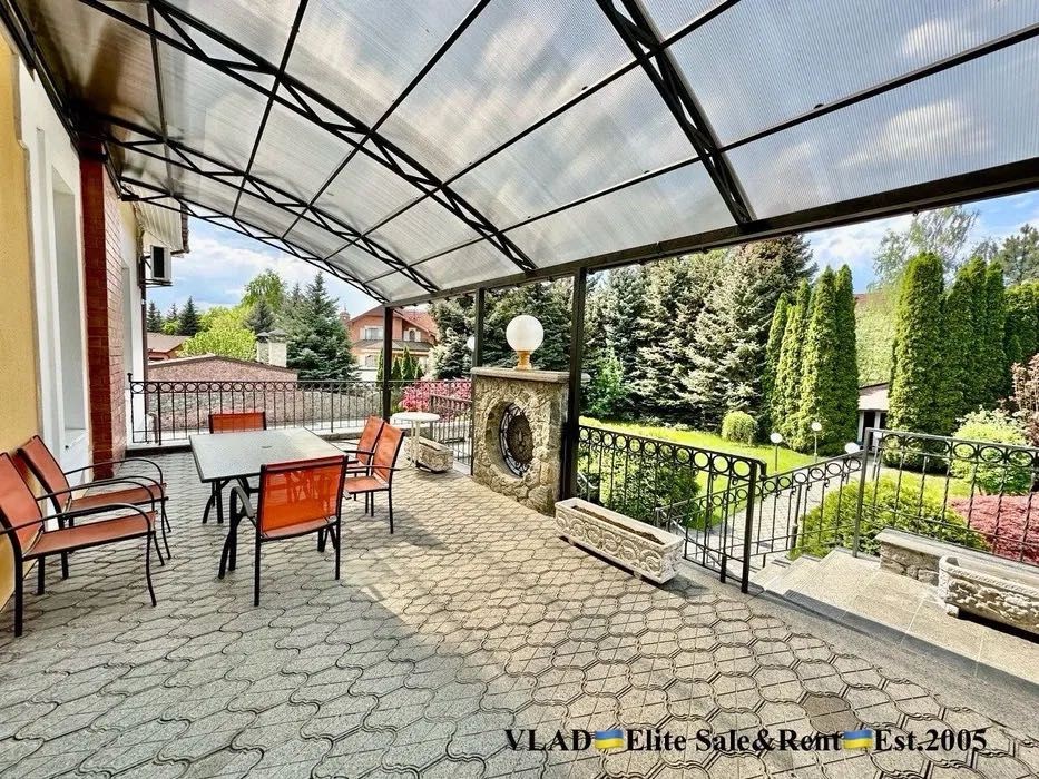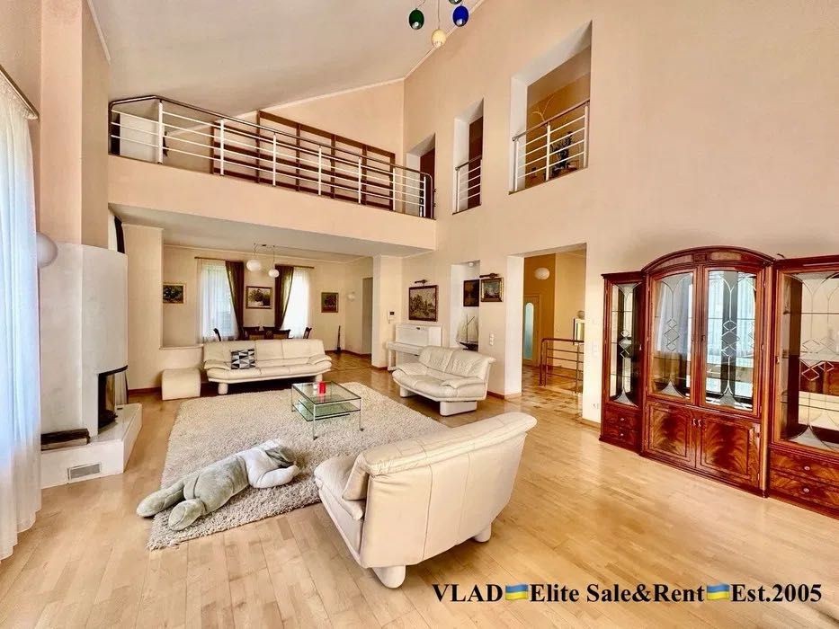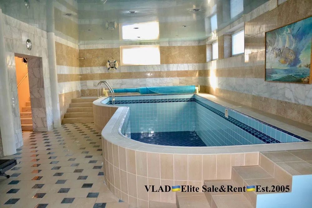 Планування: Вітальня з каміном, кухня з зоною їдальні, кабінет, 3 спальні з с/в, більярдна, басейн, сауна.
