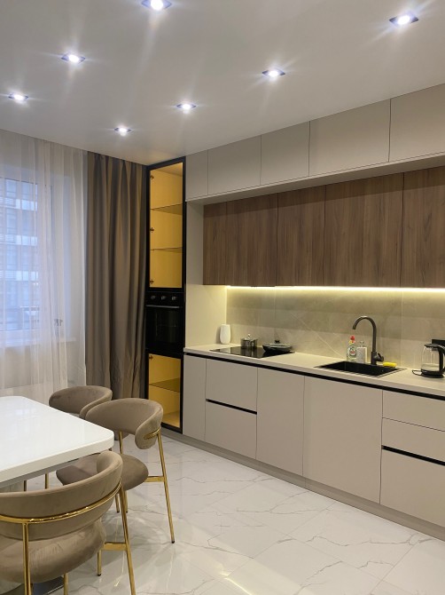 — Современная кухня с встроенной техникой (индукционная плита, духовой шкаф, холодильник, посудомоечная машина)