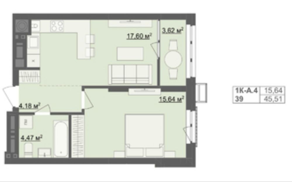 Площадь: 40 кв.м. — просторная комната и удобная кухня позволяют рационально использовать пространство.