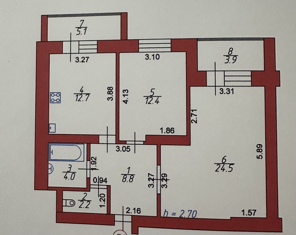 Площа кімнат 12,4 кв. м. і 24,5 кв. м