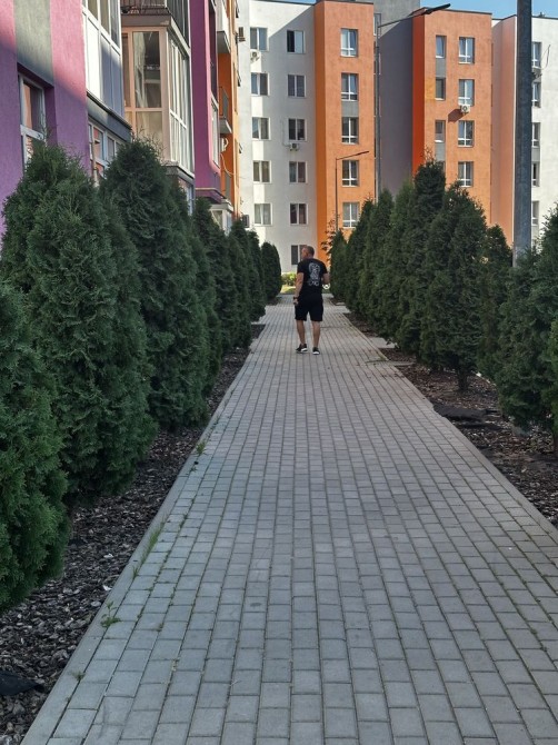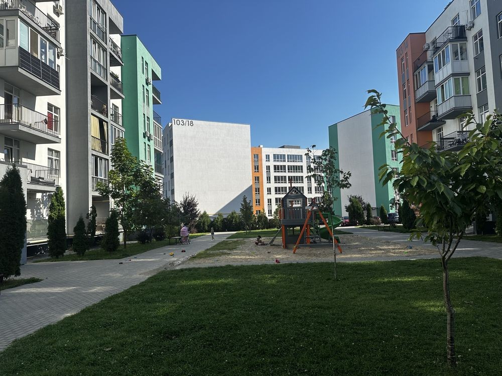 Територія зелена, закрита, є дитячі майданчики, охорона,магазин, кавʼярня, парковки для авто.