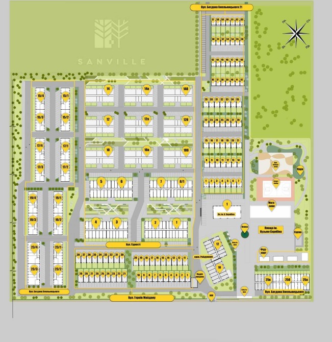 Планується дуже великий сучасний комплекс – біля 30 малоповерхових будинків по 3-4 поверхи та таунхауси. Закрита територія з охороною 24/7.