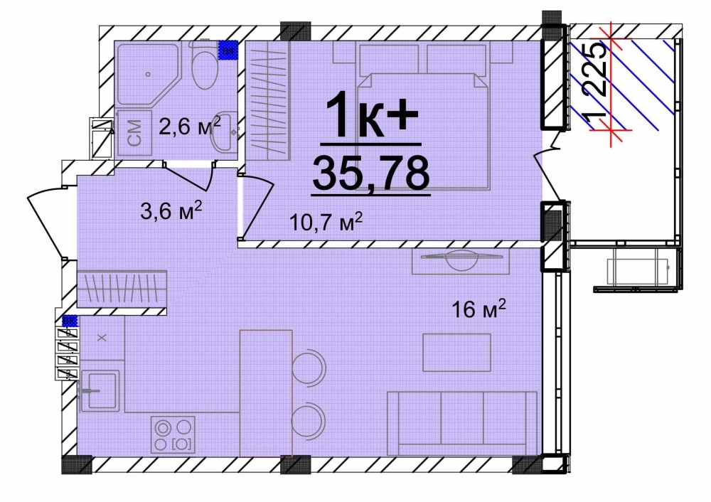 • Общая площадь 36 м2