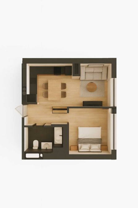 Пропонуємо Вашій увазі однокімнатну квартиру площею 39,33 м2, яка доступна на різних поверхах від 2 до 15 з вікновидом у внутрішній двір на даху першого поверху.