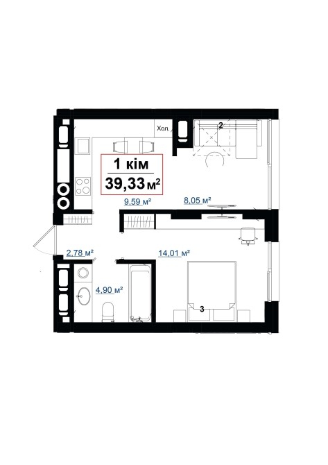 Площа кухні становить 9,59 м2, спальні - 14,01 м2, невелика вітальня - 8,05 м2, санвузол - 4,90 м2 і коридор 2,78 м2.