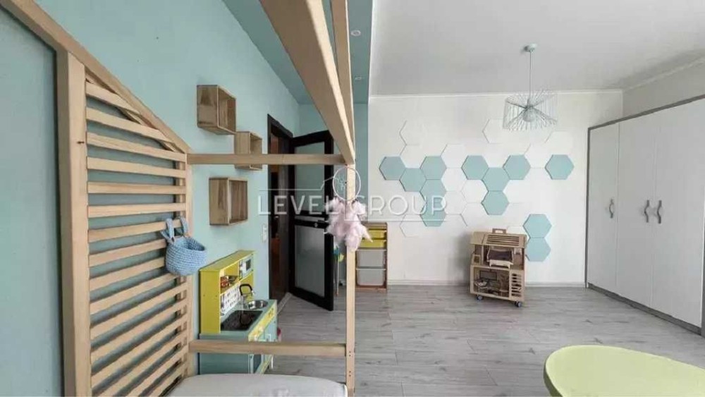 Простора квартира 117 м2, має кухню-вітальню 40м2, дві окремі спальні по 20м2, два санвузли і один засклений балкон.