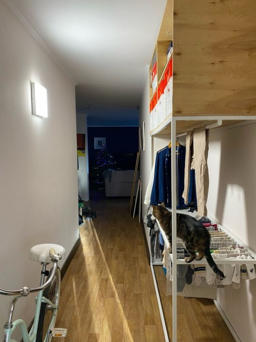 1 спальня, кімната студія з кухнею, широкий коридор (можна встановити дві відносно обʼємні шафи), обʼєднаний санвузол, засклений балкон з вікном посередині без перегородки (не просідає, якісний профіль)