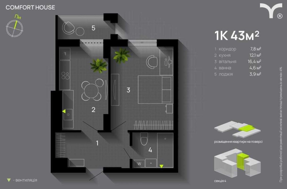 • Площадь кухни 12 м2
