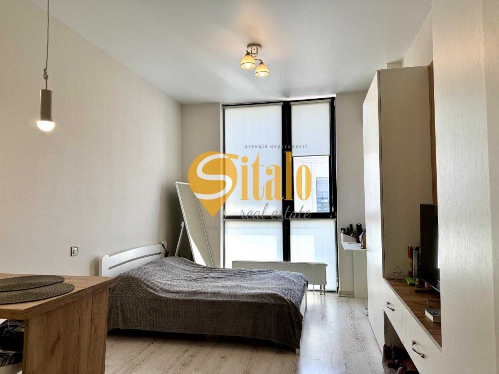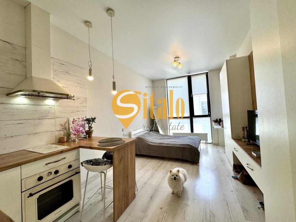 Функціональна студія з зонуванням: кухня з барною стійкою, зона відпочинку/спальні, простора система зберігання, санвузол із ванною.