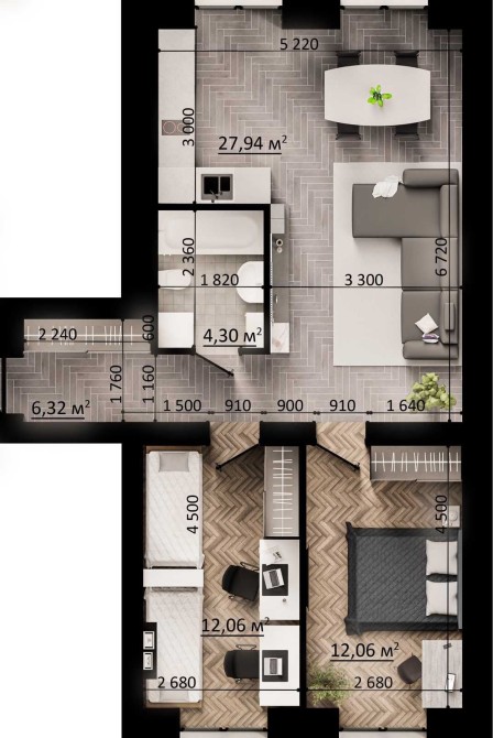 • Площадь — 44 м