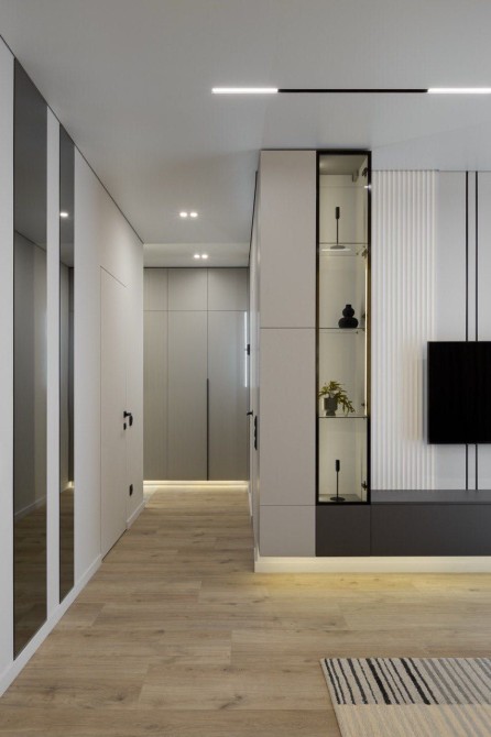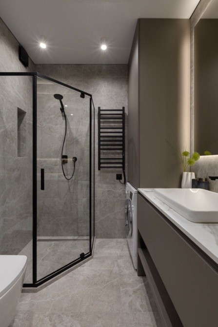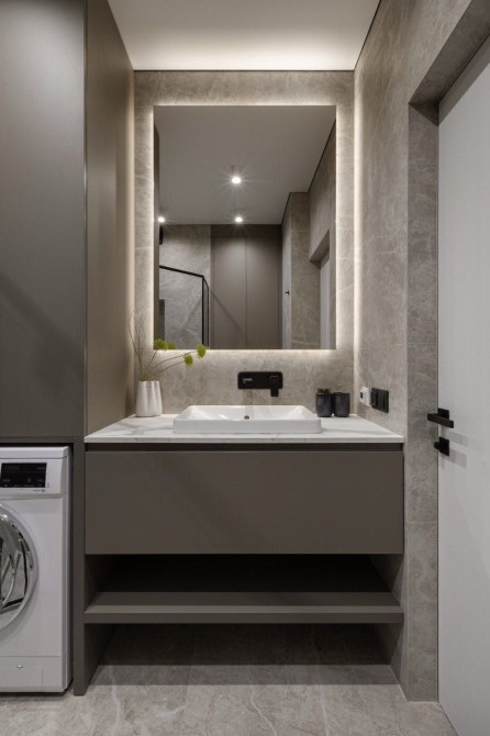 • Ванна кімната виконана в стильних сіріх тонах, з великим дзеркалом та ніжним LED-підсвічуванням — ідеальне місце для ранкових ритуалів