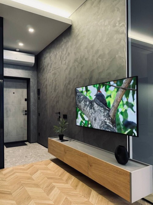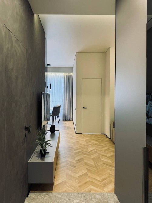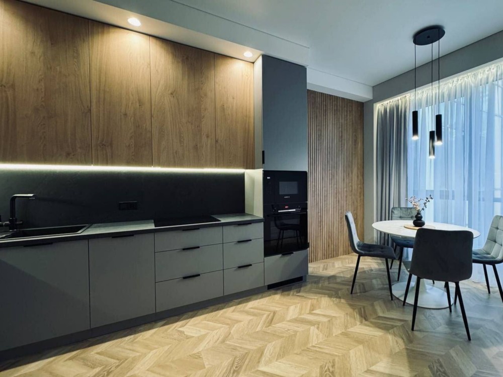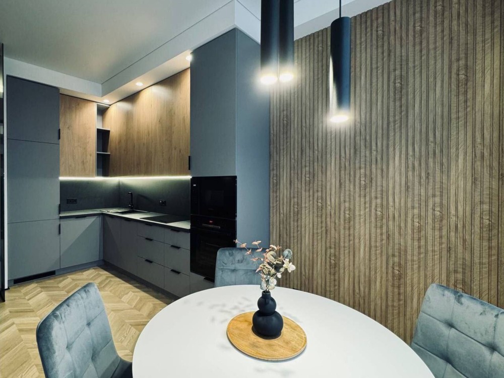 Про квартиру: Це квартира, в яку приємно повертатись. Простір продуманий до дрібниць, інтер’єр виконаний у сучасному стилі з поєднанням текстур дерева та глибоких графітових відтінків — максимум естетики та комфорту з першого кроку.