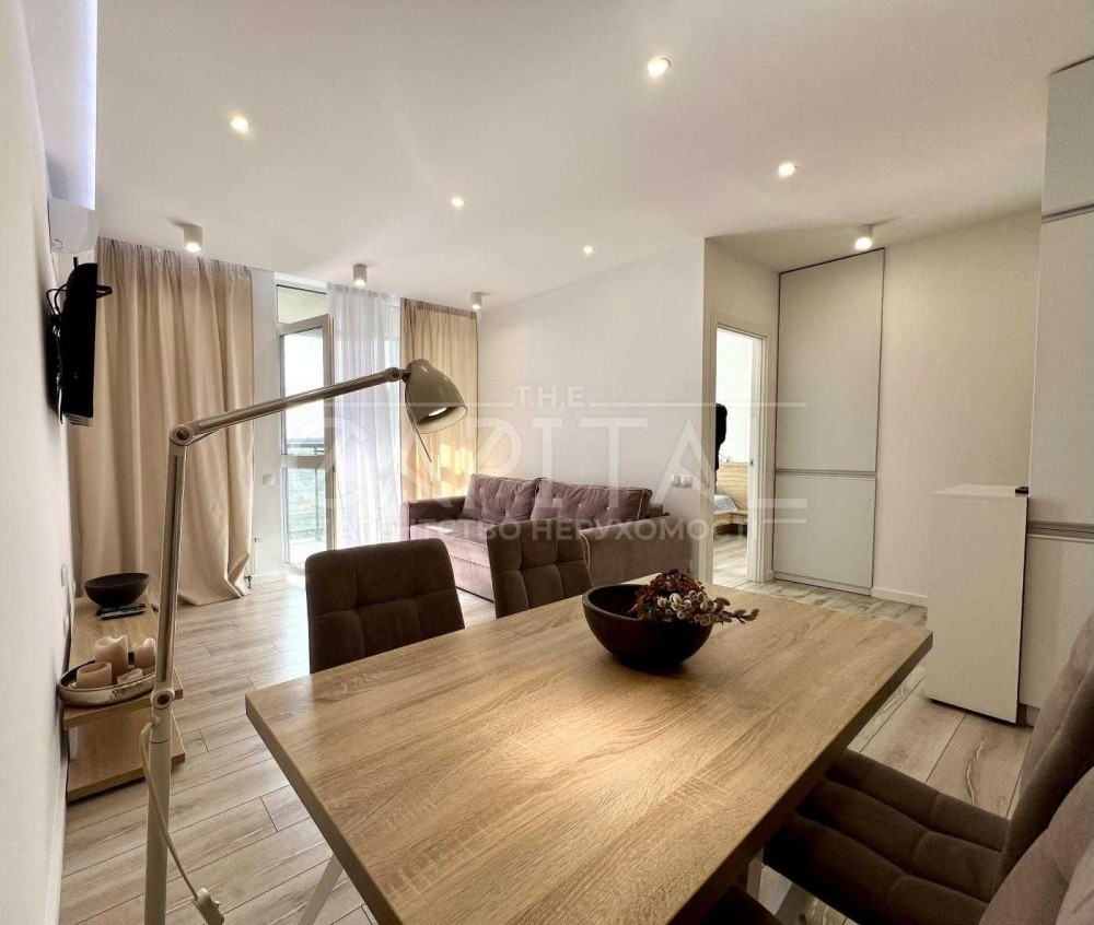 Зона гостиной с удобным диваном, имеется вся необходимая встроенная бытовая техника.Спальня оборудована большой двуспальной кроватью с ортоедическим матрасом,просторным шкафом купэ. Панорамный вид из окон, есть балкон,которы при необходимости можно оборудовать столиком со стульями.