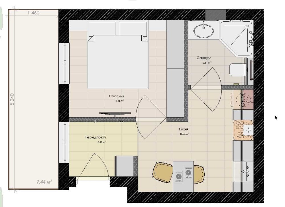 • Площадь кухни 9.45 м2