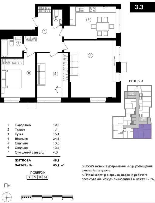 Загальна площа — 87,7 м². Поверх — 13/17. Висота стелі - 3 метри.