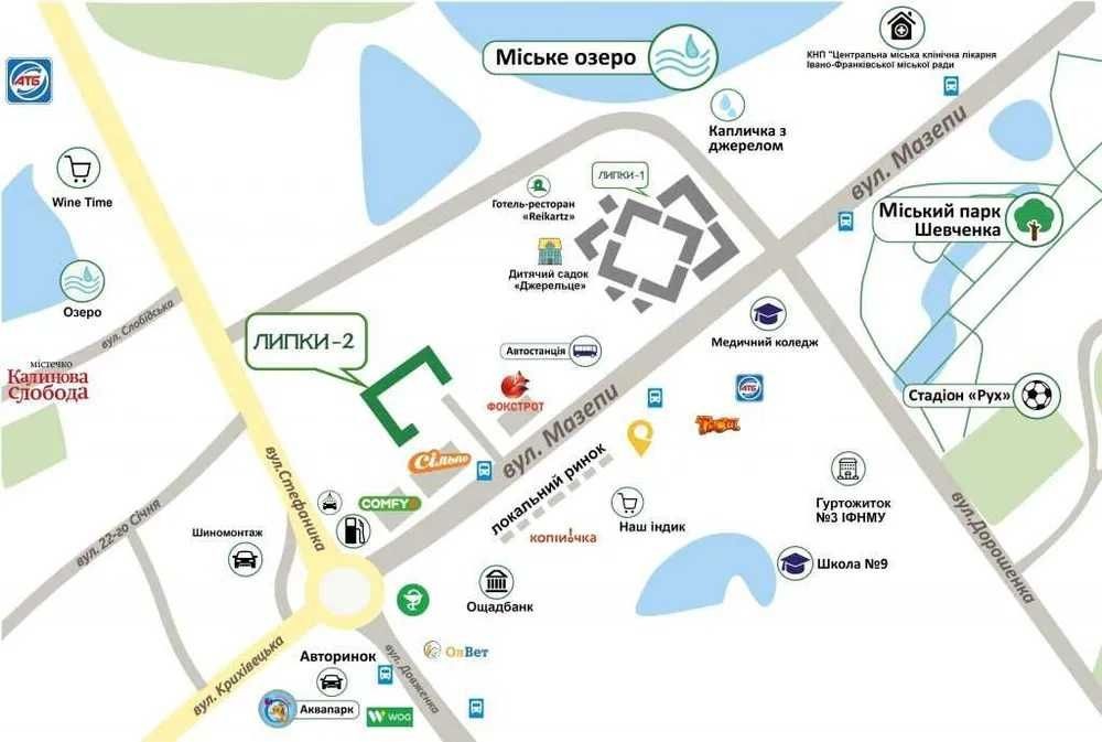 Триває будівництво другої черги містечка Липки від БК Ярковиці. ЖК знаходиться біля ТЦ Сільпо та міського озера за адресою вул. Г. Мазепи, 168. Подивитися, на скільки збудований будинок можна на сайті levada.if.ua Зручна програма розтермінування платежів від будівельної компанії без переплат та додаткових платежів: розтермінуванння до 01.09.2026 року, перший внесок - 20%