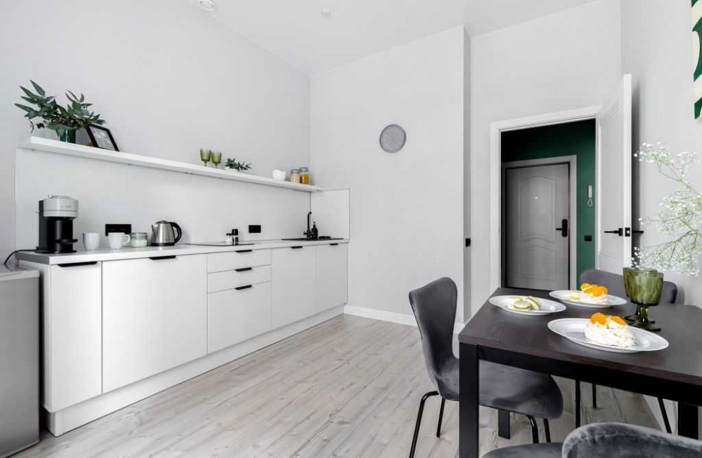 - Кухня: обеденный стол, холодильник, варочная поверхность, микроволновая печь, чайник, посуда, приборы;