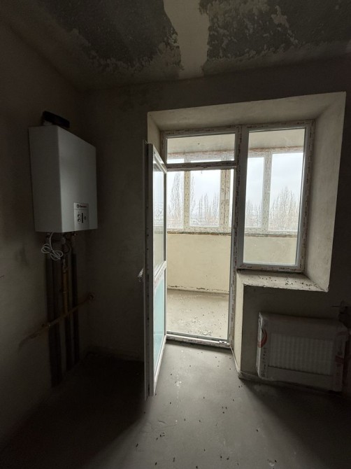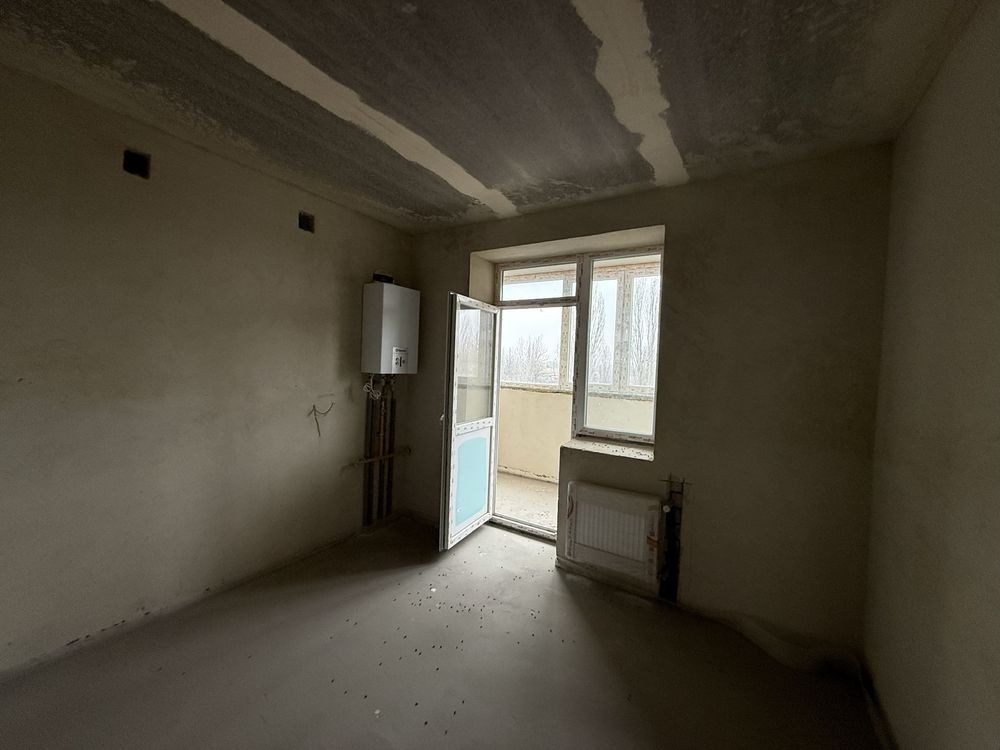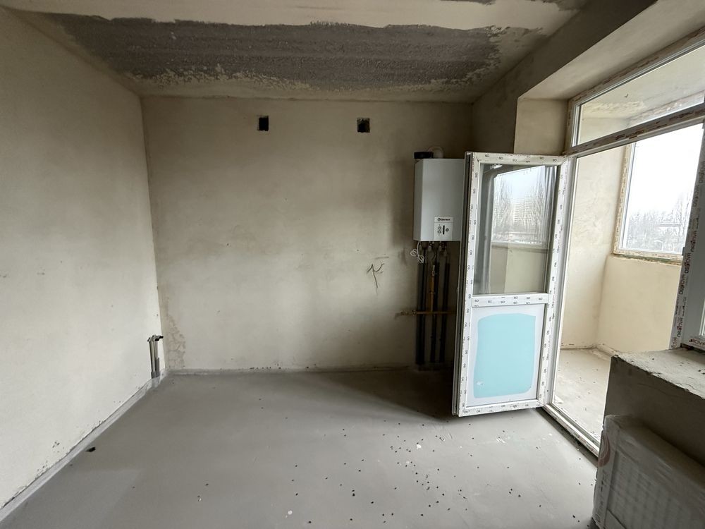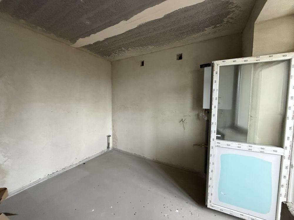 Є штукатурка стін, батареї, заведена електрика, двохконтурний газовий котел на гарячу воду та опалення