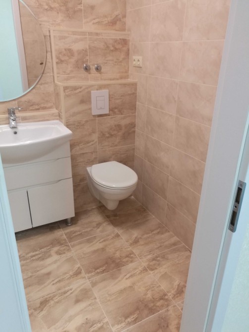 Сумісний Санвузол обкладенний сучасною плиткою встановлена сантехніка.