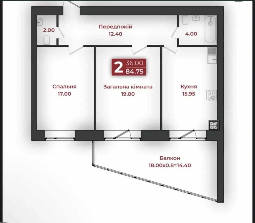 Загальна площа 85 м2 — продумане планування з окремими кімнатами, великою кухнею 16 м2 та шикарною терасою 15 м2, де можна облаштувати зону відпочинку чи місце для ранкової кави.