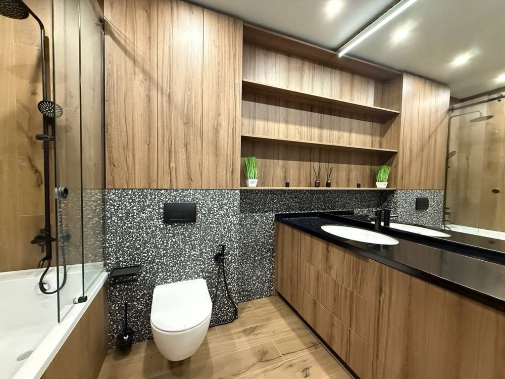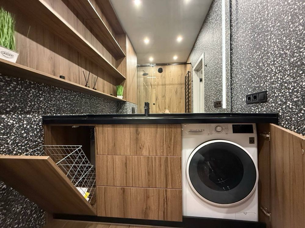 Ванна кімната та с/у обдаштовані інсталяцією, гігієнічним душом, пральною машиною з сушкою. Стільниця з каменя.