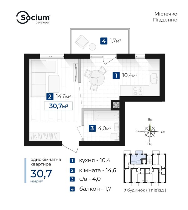 • Общая площадь 30.7 м2