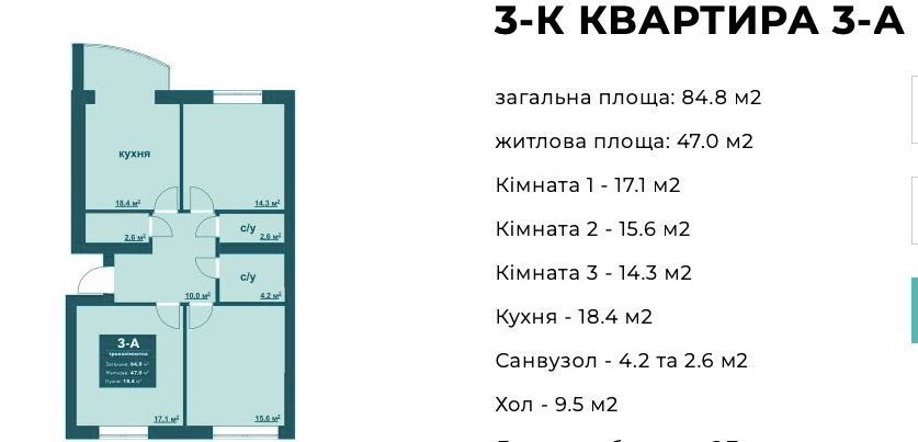 Загальна площа — 84,8 м2