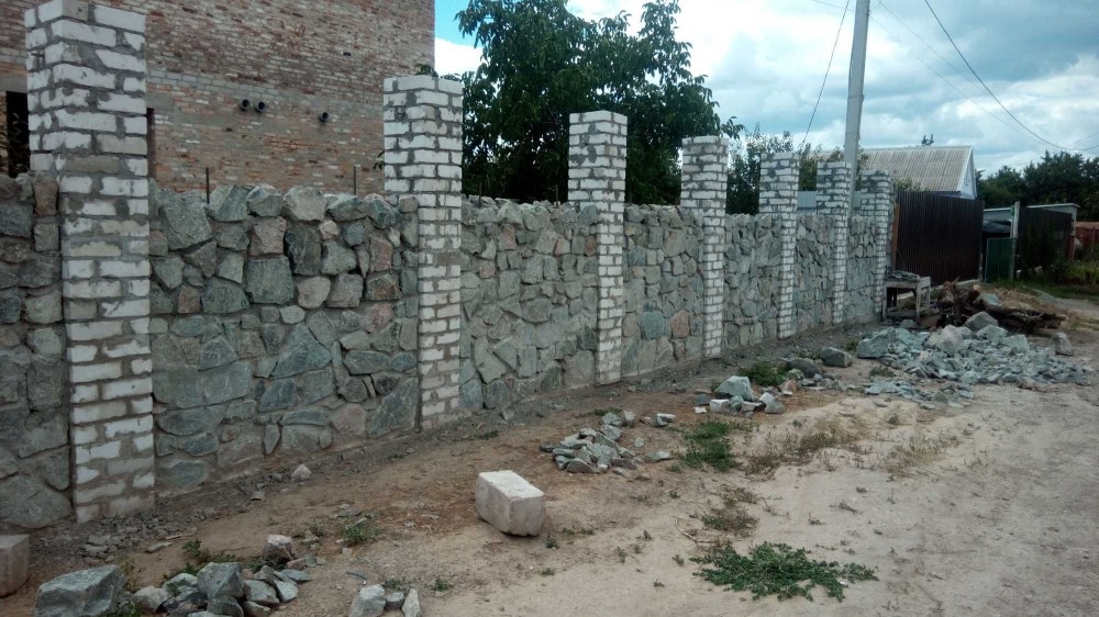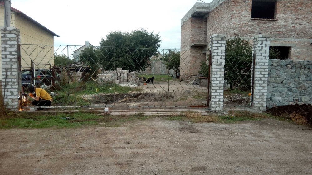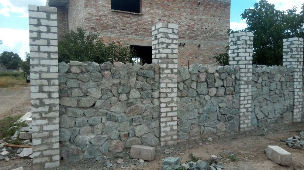 - По всему периметру поставлен забор из сетки рабицы, входная сторона забора построена из природного камня, установлены временные ворота и калитка из метала.