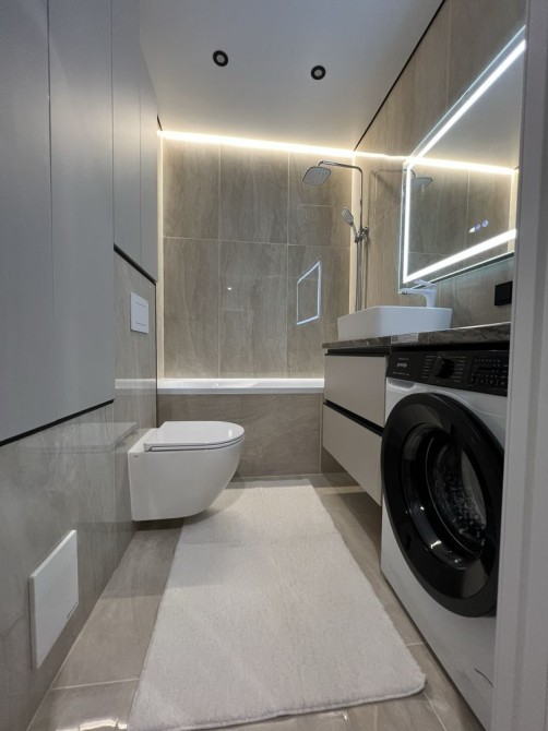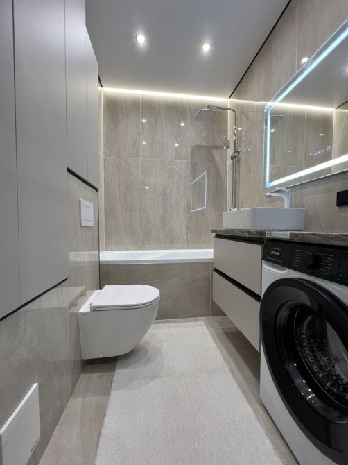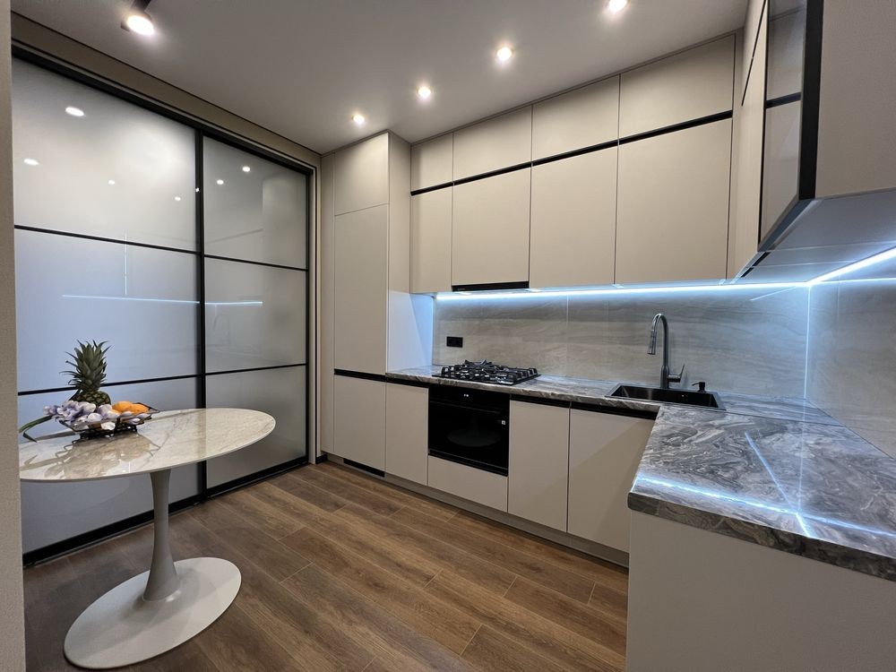 В квартирі зроблений сучасний ремонт з використанням якісних матеріалів. Всі меблі виготовлені під індивідуальне замовлення.