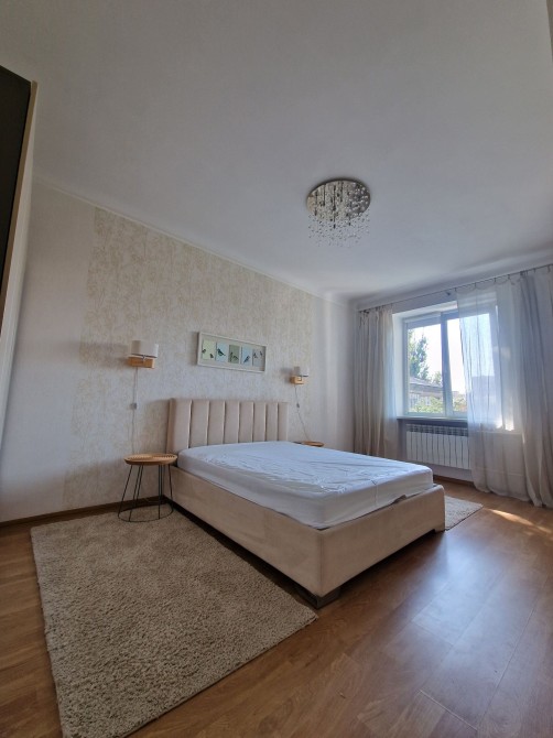 Спальня простора (18 м.), великі вікна з жалюзями блекаутами, кондиціонер. Шафа, ліжко з великою скринею в середині і ортопедичним матрацом. Приліжкові столики з дерева (дизайнерські) світильники, люстра, тумбочка, килимки, картина і штори - можуть залишитися за бажанням власника.
