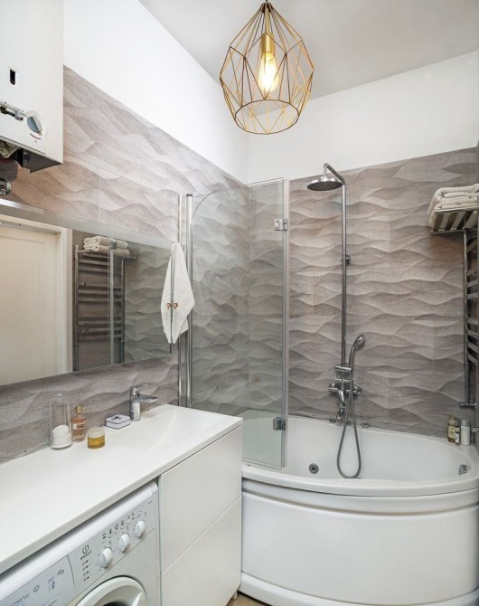 Ванна - обладнана газовою колонка, (на горищі встановлені 2 великих баки і додатковий насос для посилення напору для тих хто цінує хороший душ. Якщо раптом немає води (а таке можу бути раз в рік чи рідше), в баках досить води на 2 ванни. Тому її нестача непомітна). Кутова гідромасажна ванна зі скляною шторкою та душовою системою, великі вбудовані шафи, пральна машинка з сушкою (Samsung), тепла інфрачервона підлога, гігієнтічний душ, рушникосушка.