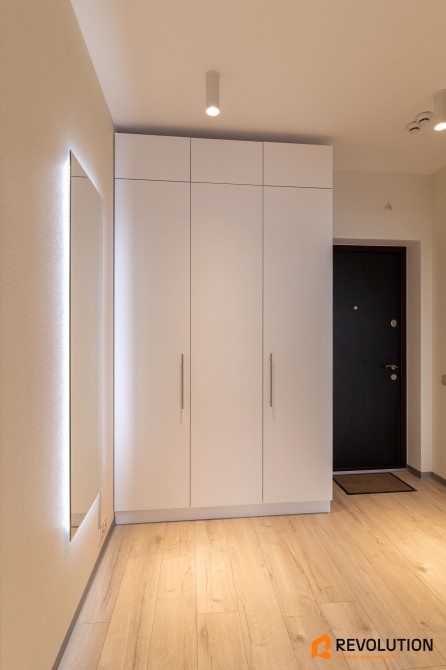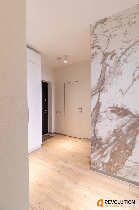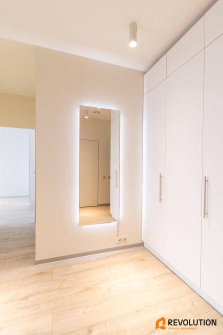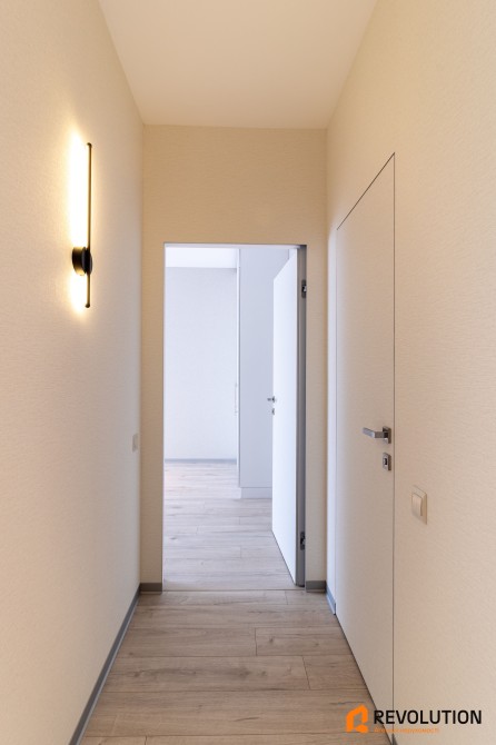 • У квартирі встановлені стильні двері прихованого монтажу, підібрані під кожну кімнату — сучасно, зручно та естетично.