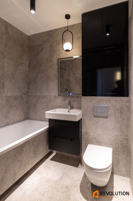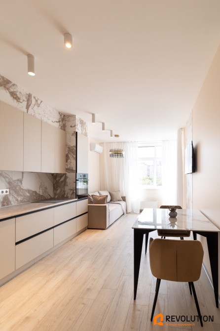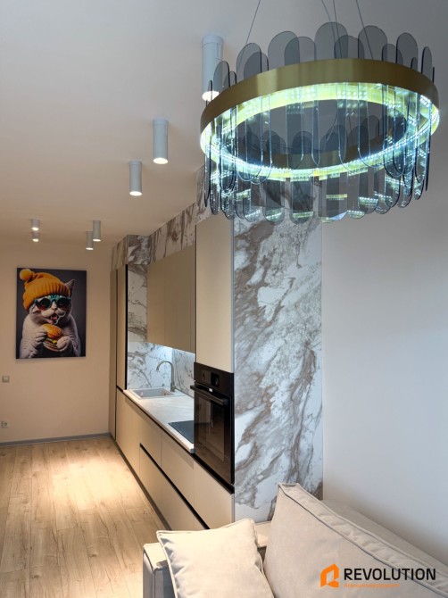 • Стелі приблизно на 10 см вищі за стандартні рішення — проводку заховали прямо в бетоні, без натяжних або гіпсокартонних конструкцій, що створює відчуття простору і високу якість оздоблення.
