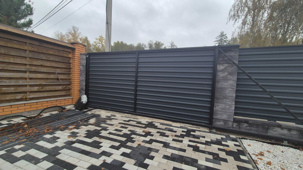 • Паркан і ворота — цегляні стовпчики + металопрофіль