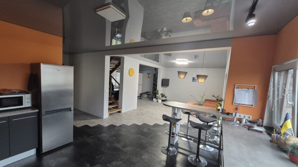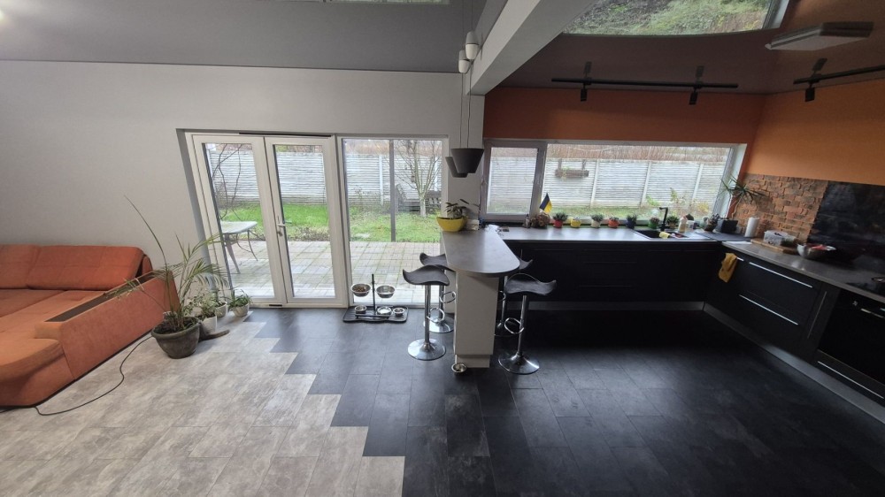 1 поверх - кухня -вітальня 53 м2 з вихідом на терасу 18 м2, санвузол, гараж, топочна.