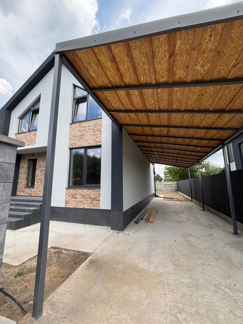 Навіс тераси і стоянки автомобілів виконані по металевому каркасу. Покриття - металевий профіль "клік фальц" аналогічний основній покрівлі.