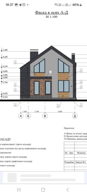 Фасади виконані по мінераловатному утеплювачу 100 мм. Зовнішня фактура баранець, фарбований в масі. Декоративні вставки з клінкерної плитки.