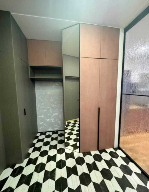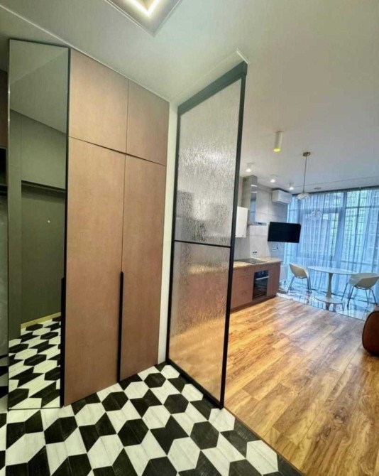 Квартира вдало зонована скляними розсувними дверима.